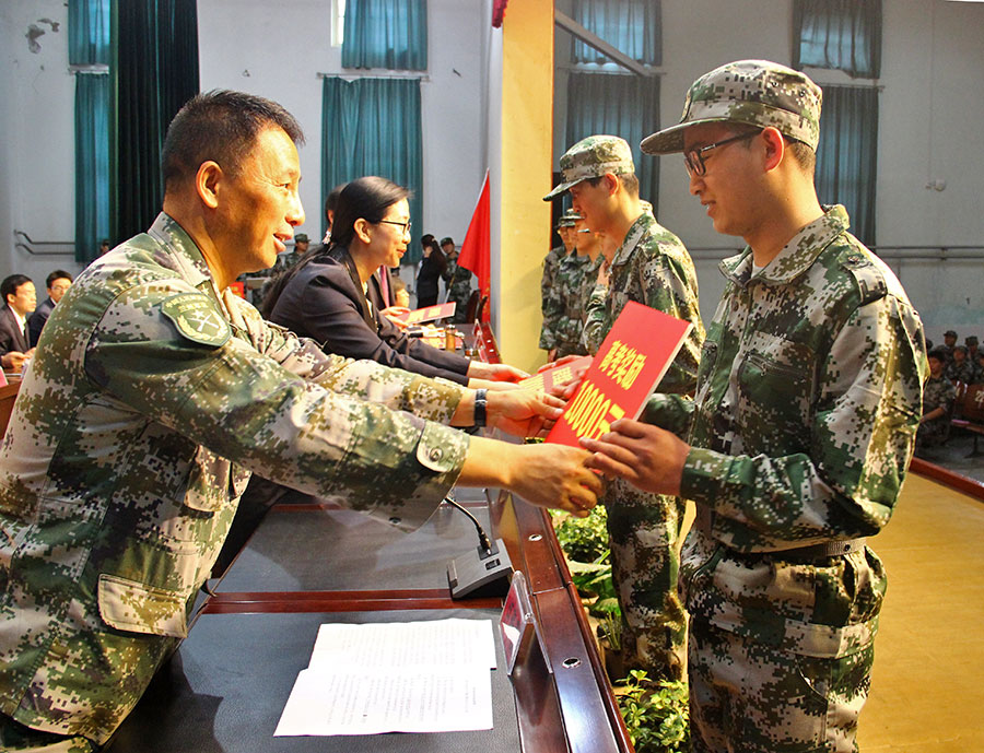 副院长张琴同志对向本次学院军训承训单位——宝鸡市秦岭学生军训基地授军训团旗,最后,伊逊智同志宣布2017级高职新生军训开始,开学典礼暨军训动员大会在热烈的掌声中圆满结束。