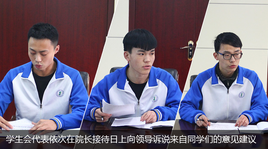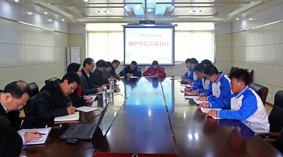11月21日下午,在行政楼三楼西会议室举行了2017年院长接待日活动,学院党委书记、院长伊逊智、副院长徐圣月、副院长张琴,以及校办、教务部、学工部、团委、教育研究室、质控办、后勤及食堂等部门负责人或代表,学生会学习部、生活部、宿管部、体育部、组织部等部门学生代表出席本次接待日活动。