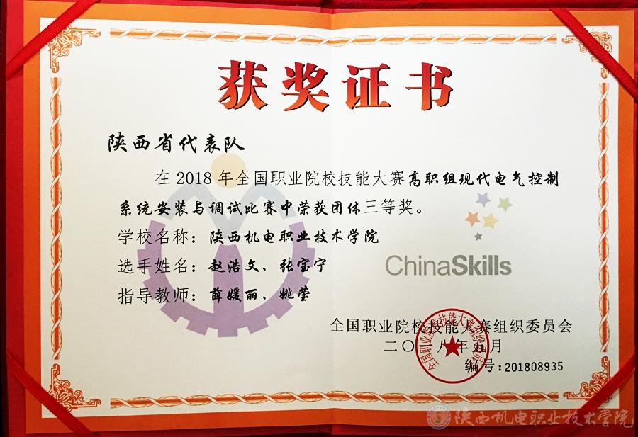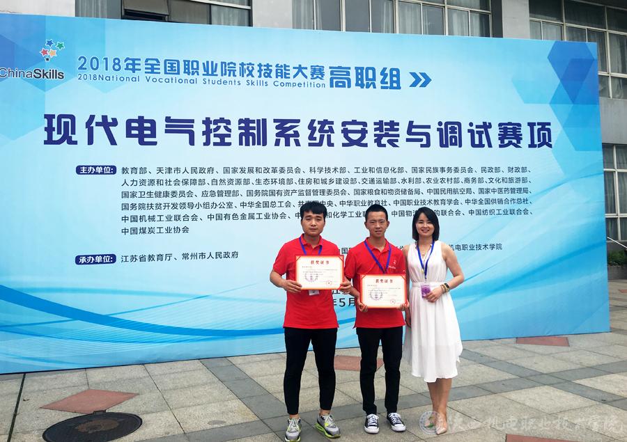 5月30日,从2018年全国职业院校技能大赛江苏省常州市赛区传来喜讯,由机电工程系学生赵浩文、张宝宁,指导教师薛媛丽、姚莹老师组成的参赛队在“现代电气”赛项中荣获团体三等奖。