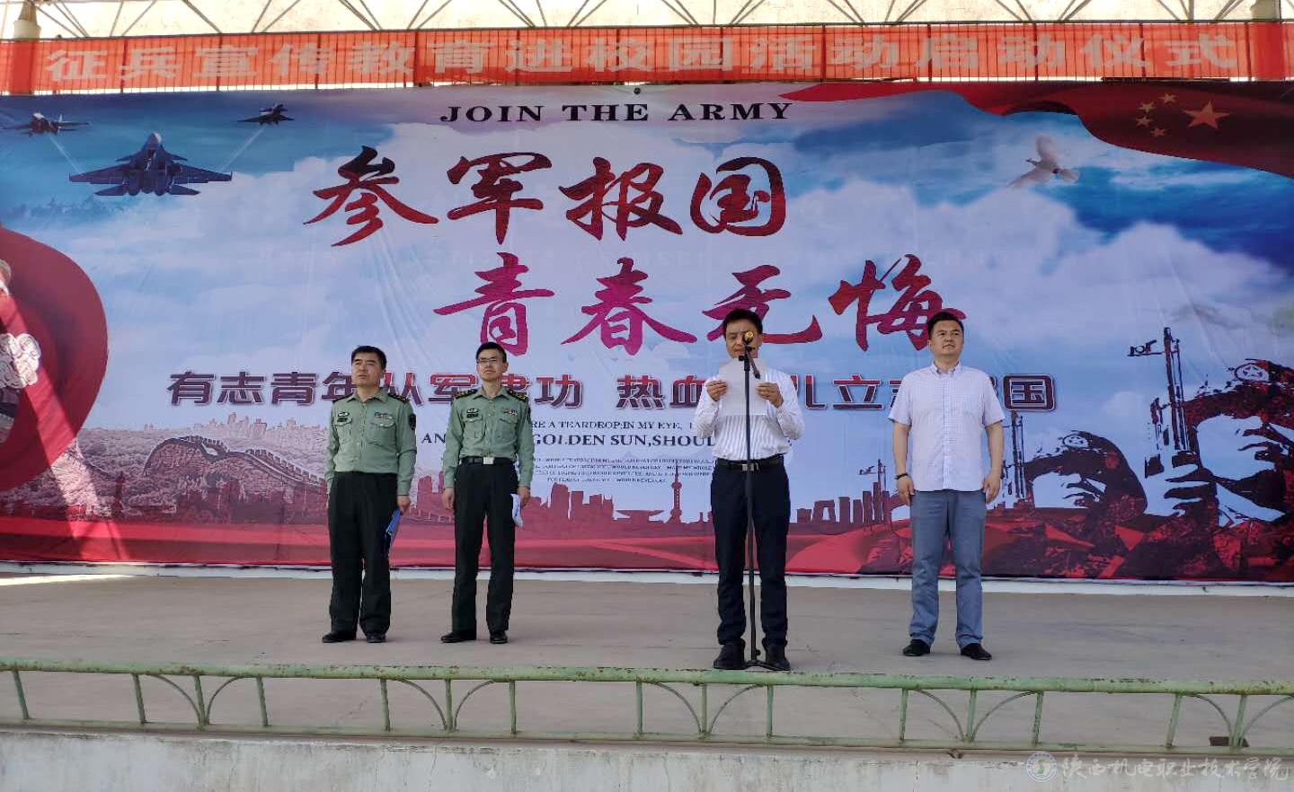 5月22日下午,宝鸡市金台区“大学生应征入伍宣传进校园”在我院隆重举行。金台区武装部苏建副部长主持会议,鱼学栋政委发言,学院党委委员、副院长张新堂出席大会并讲话。