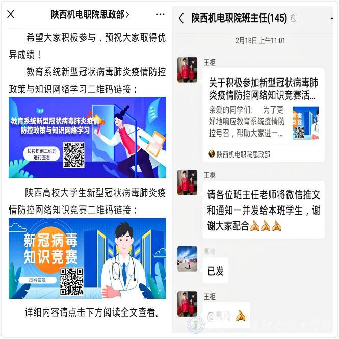 为更好地响应教育系统疫情防控号召,引导高校学生进一步熟悉了解疫情防控知识,学校思政部接到陕西高校网络思想政治工作中心、陕西省高校易班发展中心2月17日发布的《开展陕西高校大学生新型冠状病毒肺炎疫情防控网络知识竞赛活动的通知》后,高度重视,认真落实,第一时间在部门微信公众号发布相关推送,组织思政课教师和辅导员老师动员学生积极参与,收到了很好的组织宣传效果。
