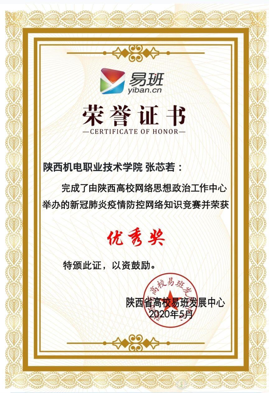 陕西高校网络思想政治工作中心、陕西省高校易班发展中心发布《陕西高校大学生新型冠状病毒肺炎疫情防控网络知识竞赛获奖名单的公告》,公布本次知识竞赛优秀组织奖名单和个人获奖名单,其中全省高校优秀组织奖15个(其中高职类院校5个),高校个人奖227个(其中高职类院校56个)。米兰官网师生在本次知识竞赛中表现出色,喜获“优秀组织奖”,我院16动漫五年班张芯若同学获得“优秀奖”。