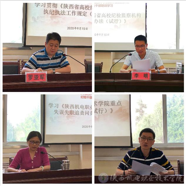 培训期间,学院纪委组织全体人员学习了陕西省纪委监委和学院纪委相关制度文件。通过制度的学习,为今后学院纪检工作人员依规依纪依法履职明确了方向。