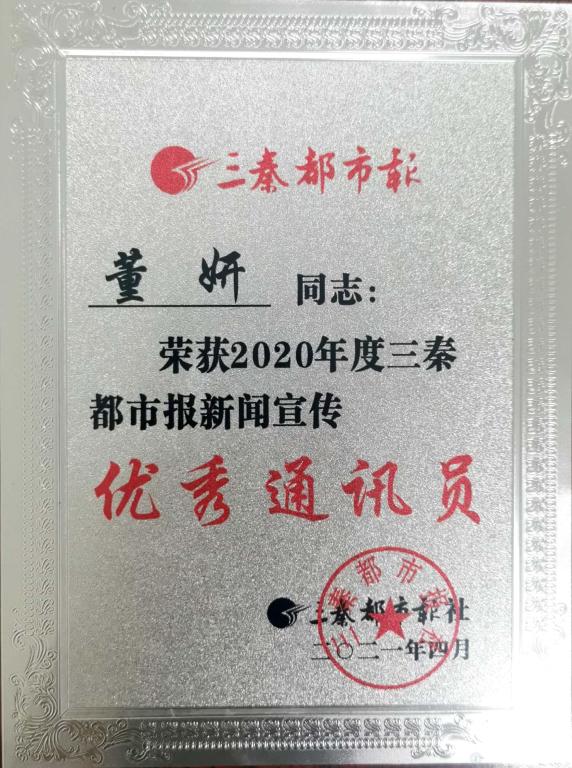 4月7日,三秦都市报宝鸡通讯员党史教育暨业务培训通联表彰大会在宝鸡西建非公有制企业党建学院召开。米兰官网党委宣传部董妍同志荣获2020年度三秦都市报“优秀通讯员”,受到了表彰奖励。