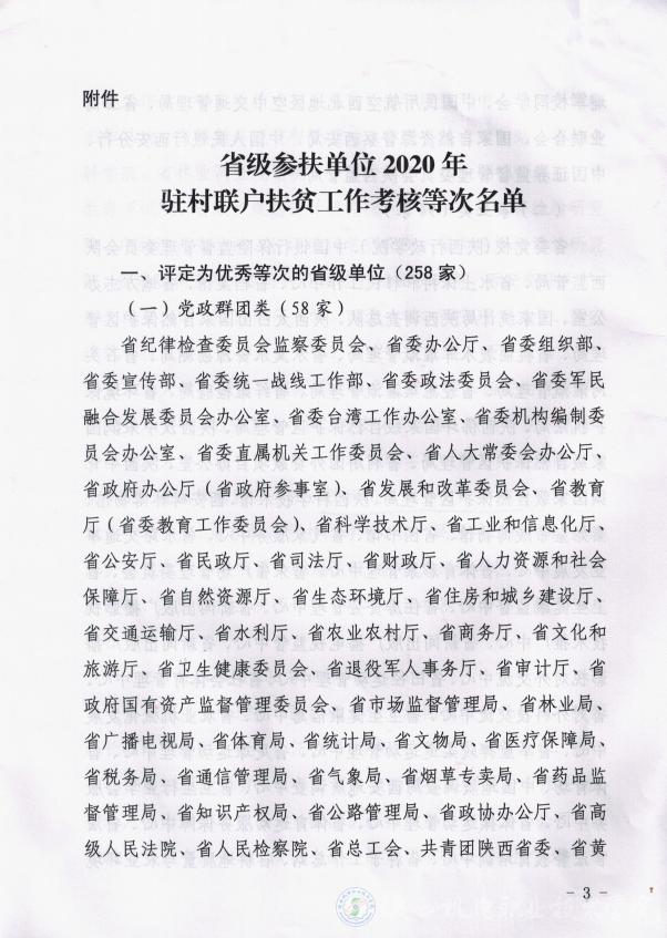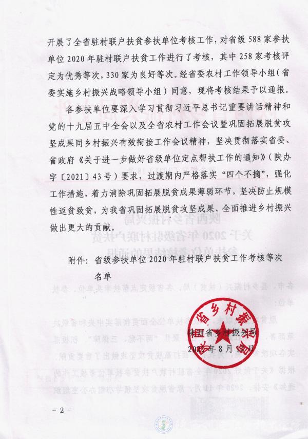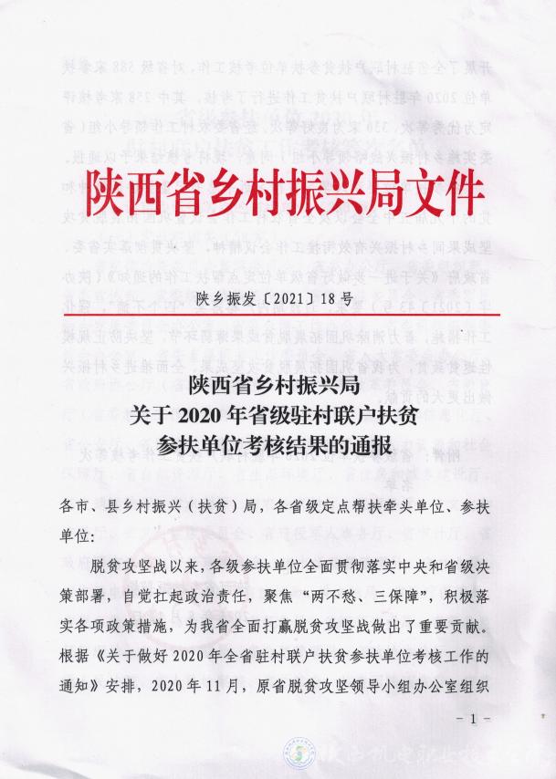 近日,陕西省乡村振兴局对2020年度全省驻村联户扶贫考核工作结果进行了通报。AC米兰中文官方网站驻村扶贫工作经过严格评定,考核结果为优秀。本次驻村联户扶贫工作考核针对全省588家帮扶单位进行了逐项量化考核,根据评估结果共评定驻村帮扶优秀等次单位258家、良好等次单位330家。