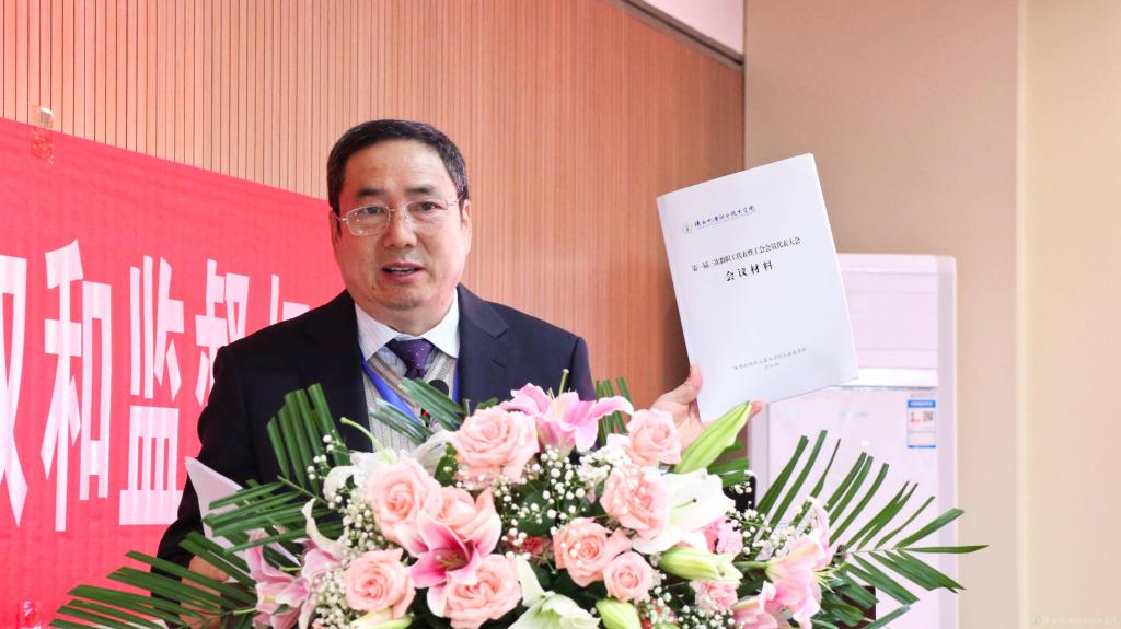 党委书记伊逊智致闭幕词,伊逊智对过去五年学校工会依法保障教职工合法权益,落实教职工应有应得的福利待遇,组织开展精神文化活动,增强集体凝聚力,共建和谐校园所做工作及学校“十三五”取得的显著成绩表示肯定,面对新目标、新任务、新机遇、新挑战,就抓好“十四五”规划的贯彻落实工作,着重强调三点意见,一是立足新发展阶段,统一思想认识,加强学习宣传,营造良好发展环境氛围,全面促使“十四五”规划深入人心;二是贯彻新发展理念,加强沟通协调,分解目标任务,科学衔接总规划分规划,努力确保“十四五”规划有效实施;三是融入新发展格局,加强组织领导,明确责任分工,聚焦提升办学综合实力,合力推进“十四五”规划落地落实。鼓励全体教职工抢抓机遇、齐心协力、同舟共济,争做担当有为的行动者、创新进取的奋斗者、干事创业的实干家,高站位、高标准、高效率推动落实“十四五”发展规划,奋力谱写学校新时期高质量发展的新篇章!
