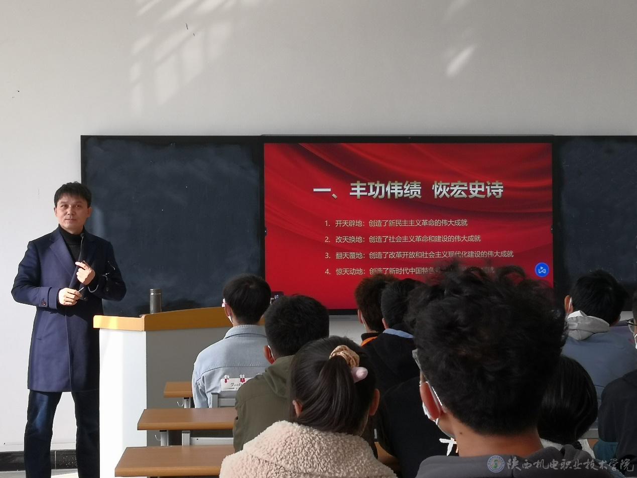 10月29日上午,院长助理赵争东在博学楼207教室为21物联网1、21物联网2合班学生上形势与政策课,讲授《奋斗百年路,启航新征程》专题内容。