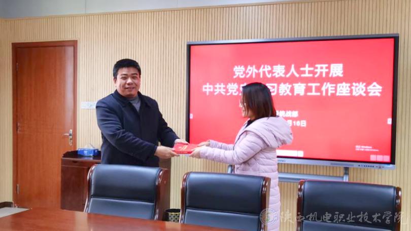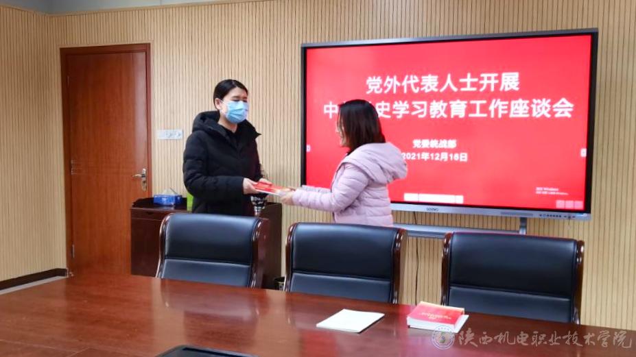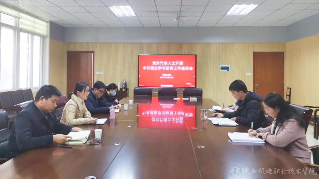 2021年12月16日,学校党委统战部在蟠龙校区图书馆二楼会议室召开党外代表人士开展中共党史学习教育工作座谈会。党委委员、院长助理、党委统战部部长赵争东,智能制造学院党支部书记、副院长薛媛丽,电子与信息学院党支部书记、副院长高赋,智能制造学院副教授、九三学社清姜支社主委李小强,电子与信息学院系主任、宝鸡市人大代表、无党派人士张琼副教授,党委统战部人员参加会议。会议由党委统战部综合科科长张玉琼主持。