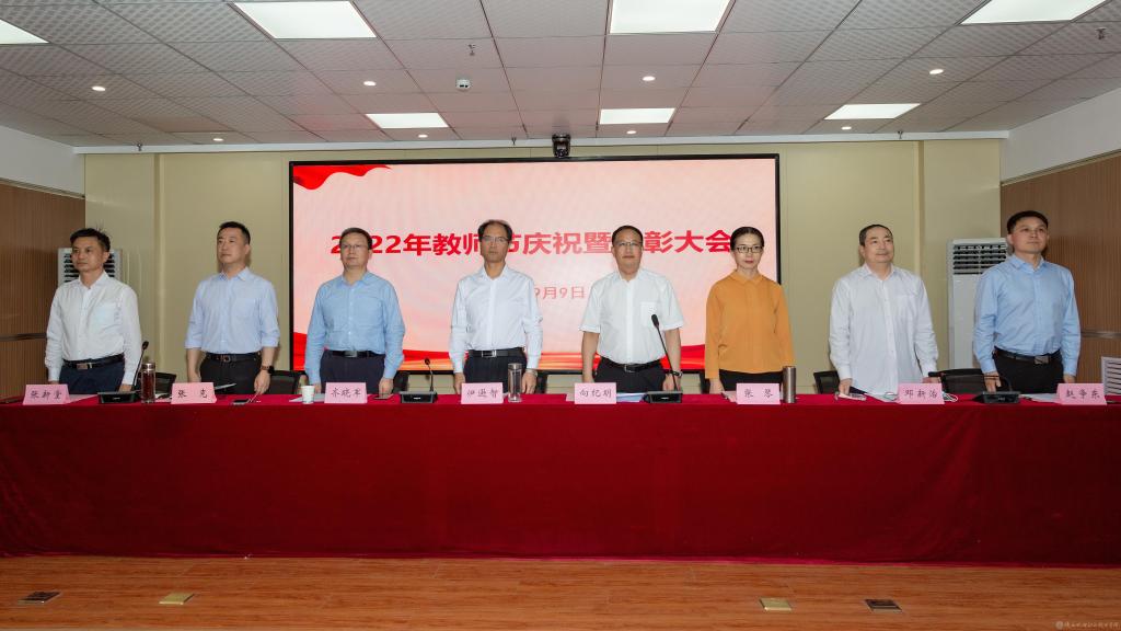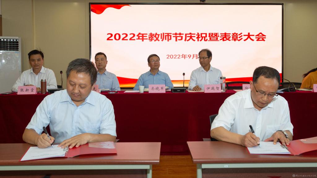 秋澄景清,硕果馥郁,9月9日下午,庆祝第三十八个教师节暨表彰大会在宝福路校区汽车机电大楼四楼视频会议室隆重举行。党委书记伊逊智、党委副书记、院长向纪明,党委副书记、纪委书记齐晓军,党委副书记、副院长张琴,党委委员、副院长张克,副院长邓新治、张新堂,党委委员、院长助理赵争东出席大会,人事处、宣传部、教务处、各教学部门负责人及受表彰教师代表、新入职教师参加会议,会议由党委副书记、院长向纪明主持。