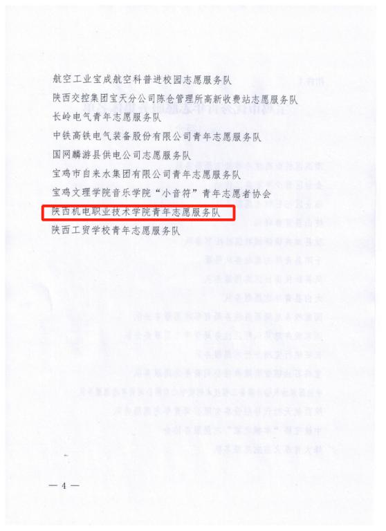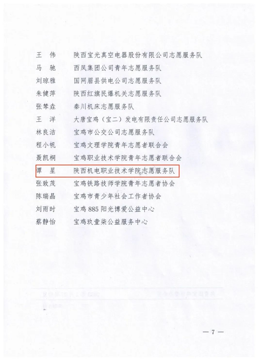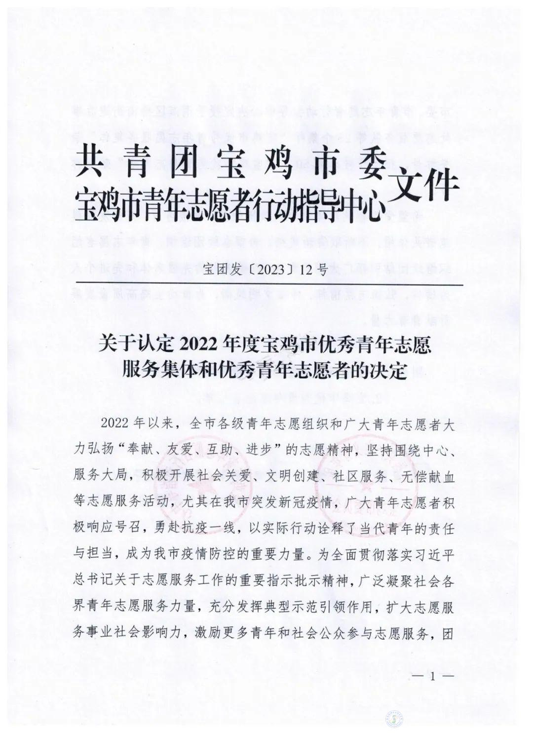 近日,共青团宝鸡市委、宝鸡市青年志愿者行动指导中心发布“关于认定2022年度宝鸡市优秀青年志愿服务集体和优秀青年志愿者的决定”文件(宝团发〔2023〕12号),我院青年志愿服务队荣获“宝鸡市优秀青年志愿服务集体”荣誉称号、我院谭星同学荣获“宝鸡市优秀青年志愿者”荣誉称号。
