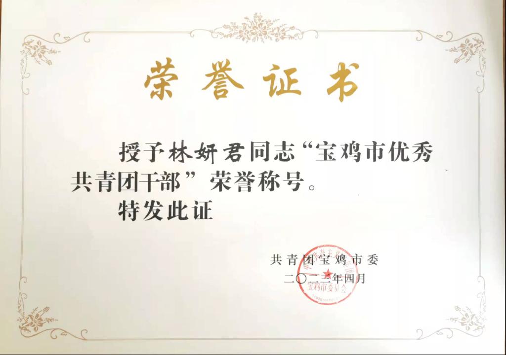 团委干事 林妍君 获“2022年度宝鸡市优秀共青团干部”荣誉称号