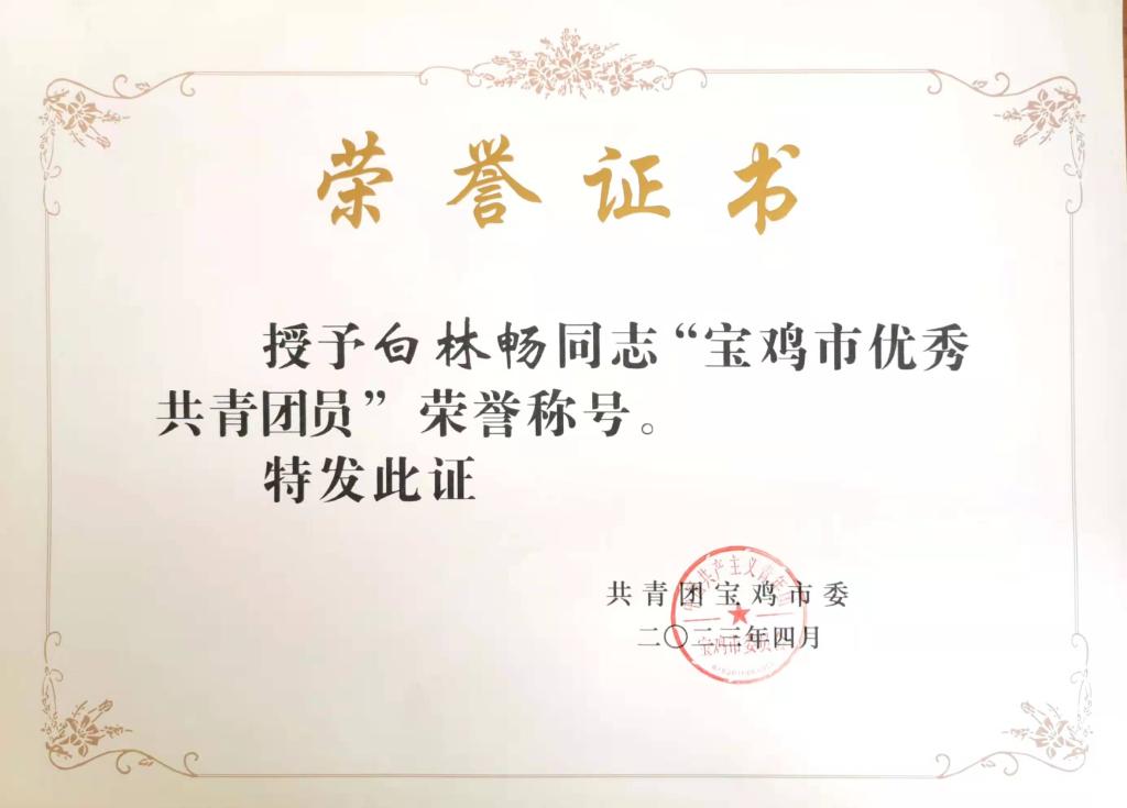 2021级汽车制造专业 学生 白林畅 获“2022年度宝鸡市优秀共青团员”荣誉称号
