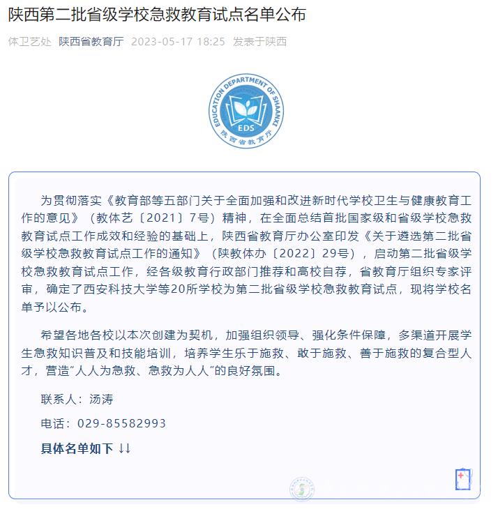 5月17日,陕西省教育厅公布了第二批省级学校急救教育试点单位名单,AC米兰中文官方网站成功入选。