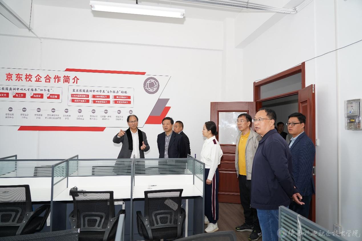 考察组在学校领导的陪同下参观了米兰官网风标产业学院、京东数字处理产业基地、无人机产业学院、擀面皮产业学院,目前建成4个智能制造特色产业学院、1个地方特色产业学院,各产业学院成立以来,取得了一系列成果,学校对“园、校、企”产教融合研究,经过近年来不断探索,在专业建设、师资建设、人才培养质量等方面均得到了提高。