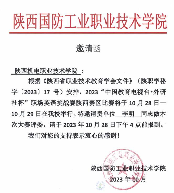 10月28日—29日,由中国职业技术教育学会主办的2023年“中国教育电视台·外研社杯”职场英语挑战赛演讲大赛在陕西国防工业职业技术学院成功举办。来自全省29所高职院校的160余名选手参加了英语演讲和英语写作赛项。
