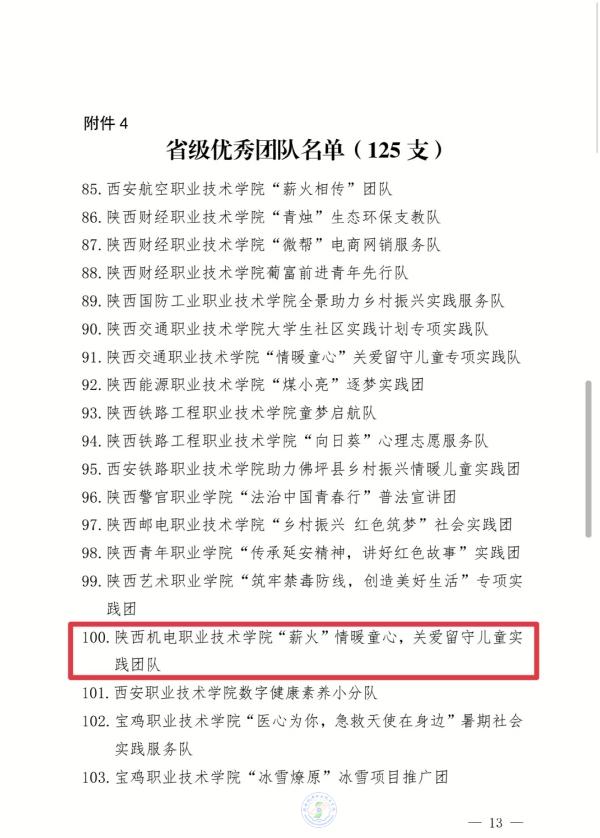 近日,中共陕西省委宣传部、中共陕西省委文明办、中共陕西省委教育工委、共青团陕西省委、陕西省学生联合会对2023年全省大中专学生志愿者暑期文化科技卫生“三下乡”社会实践活动先进集体和个人进行了通报表彰。米兰官网“薪火”情暖童心,关爱留守儿童实践团队获评“省级优秀团队”,李妙桐同学荣获“省级先进个人”。