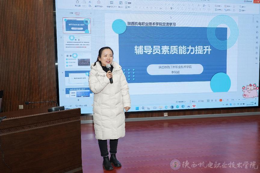 陕西铁路工程职业技术学院工程管理与物流学院专职辅导员李阿娟老师围绕辅导员素质能力提升主题开展经验交流,她充满激情地分享了自己参加陕西省辅导员素质能力大赛的经验与心得体会,并从十多年的辅导员工作经历出发,讲述了如何做好辅导员的工作的点点滴滴,李老师的爱生情怀及思辨能力,深刻吸引与感染了每一位老师。