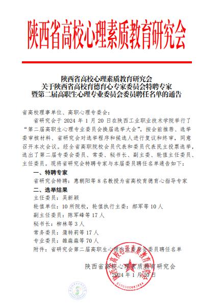 第二届陕西省高职心理专业委员会换届选举大会暨陕西省高职院校2024年心理育人工作论坛于1 月20 日在陕西工业职业技术学院举行,陕西省高校心理素质教育研究会会长郑林科,陕西工业职业技术学院党委书记惠朝阳,党委副书记贺天柱等领导参加会议。米兰官网党委学工部部长、学生处处长王建斌,心理教育