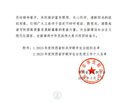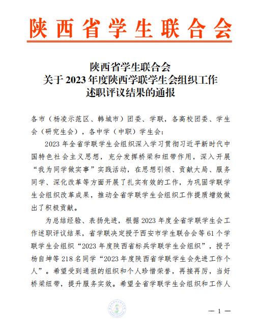 近日,陕西省学生联合会下发《关于2023年度陕西学联学生会组织工作述职评议结果的通报》,AC米兰中文官方网站学生会李妙桐同学被评为“2023年度陕西省学联学生会先进工作个人”。