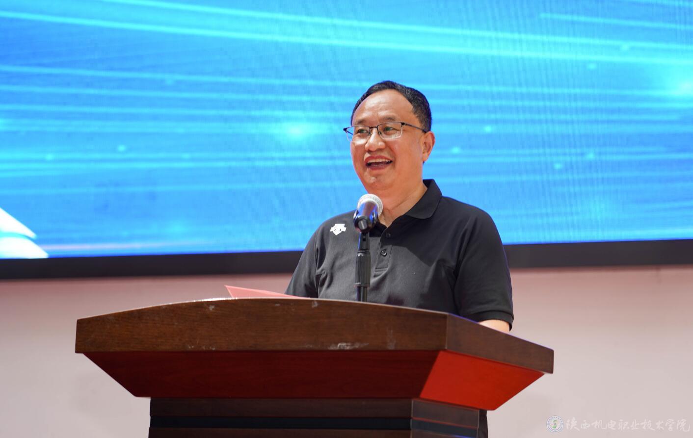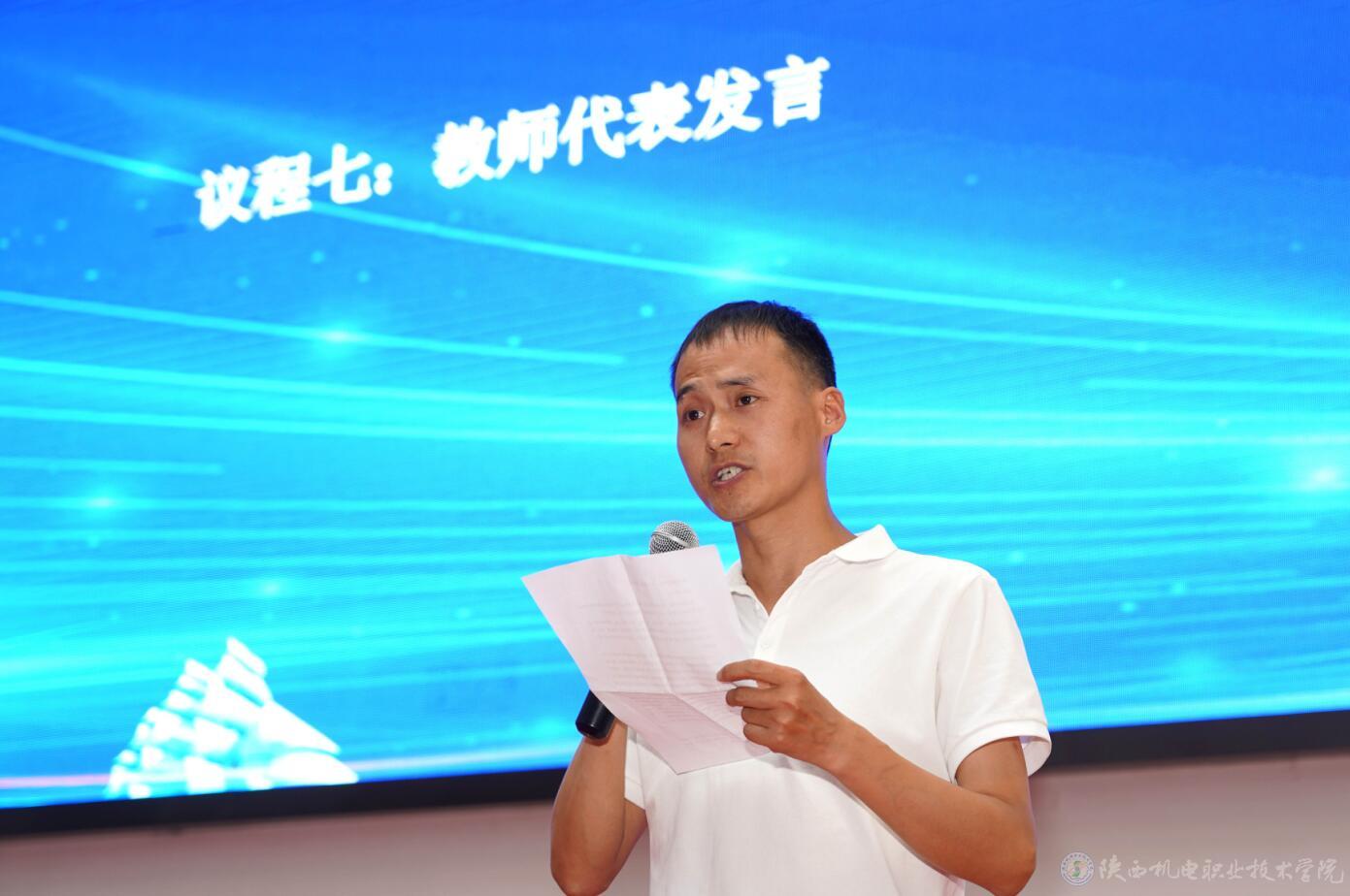 电子信息学院教师代表严军峰老师发言,他希望同学们能够“学一技之长立一生之本,以一技之长赢美好生活,用一技之长促建功立业”,并与同学们一起营造一技在手,一生无忧的良好社会氛围。