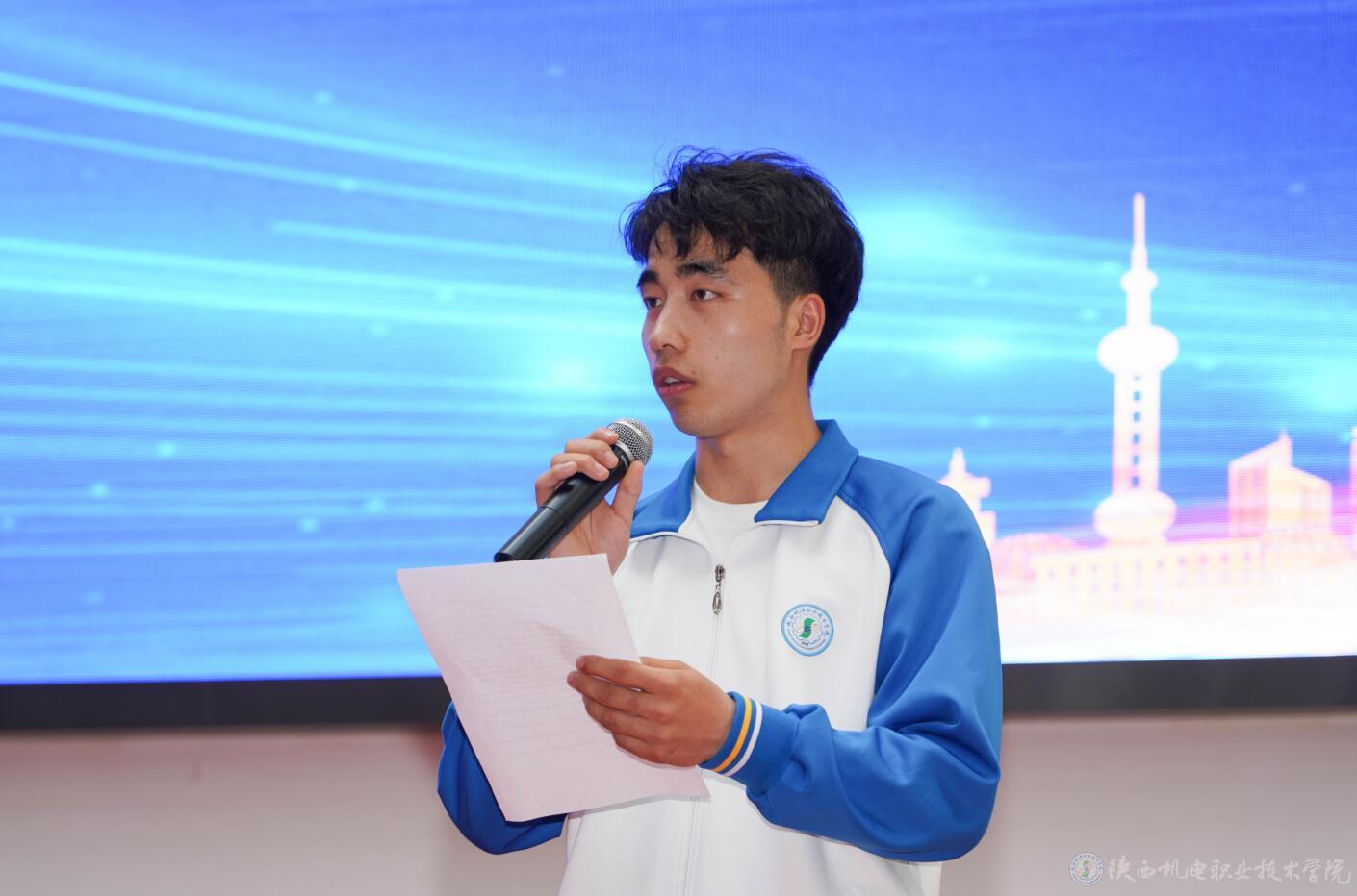 电子信息学院学生代表车遨乐发言,他表示作为新时代的新青年,将努力钻研技术技能,不断增强创新能力,全面提高自身的职业素质和技能水平,争做一名高素质技术技能人才!