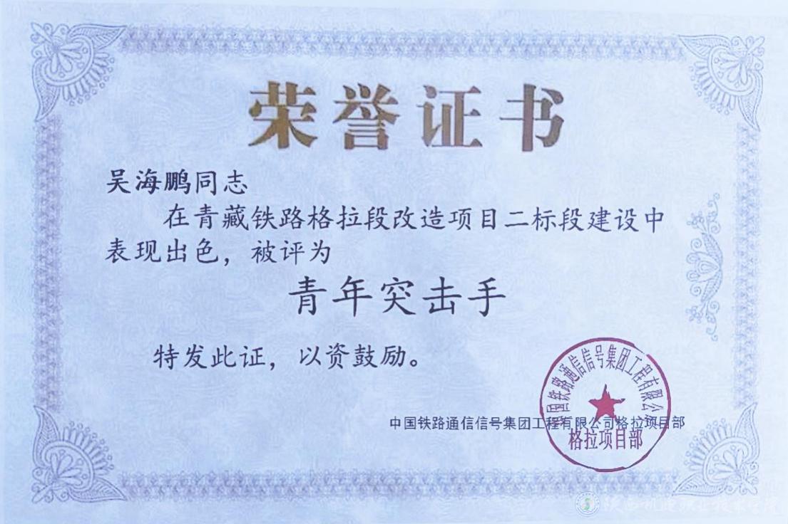 2022年12月,正值冬季,在中国铁路通信信号集团工程局有限公司中青藏铁路格拉段的道岔及信号系统改造施工中,青藏高原异常寒冷,加上高原缺氧,好多职工以身体适应不了高原气候为由婉拒前往西藏地区工作。而初出茅庐的吴海鹏不畏艰难、义无反顾,主动请缨参与到了青藏铁路格拉段道岔及信号系统改造施工项目中。在项目建设中,由于吴海鹏表现出色,被集团公司格拉项目部评为“青年突击手”。