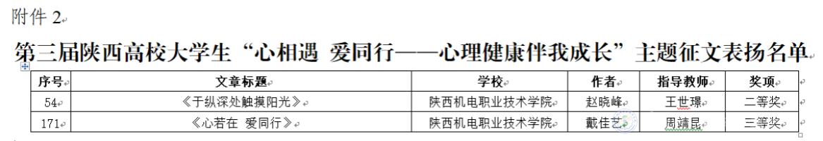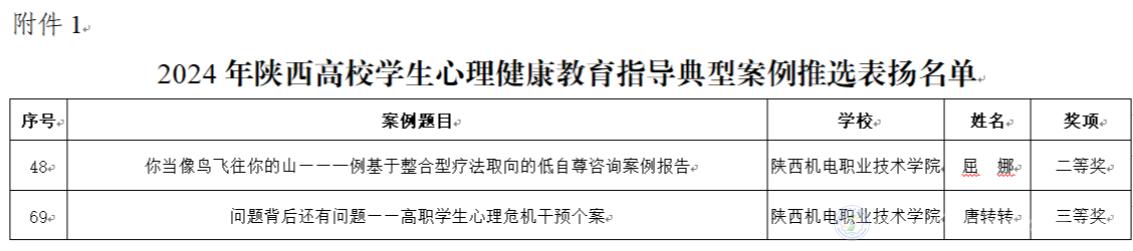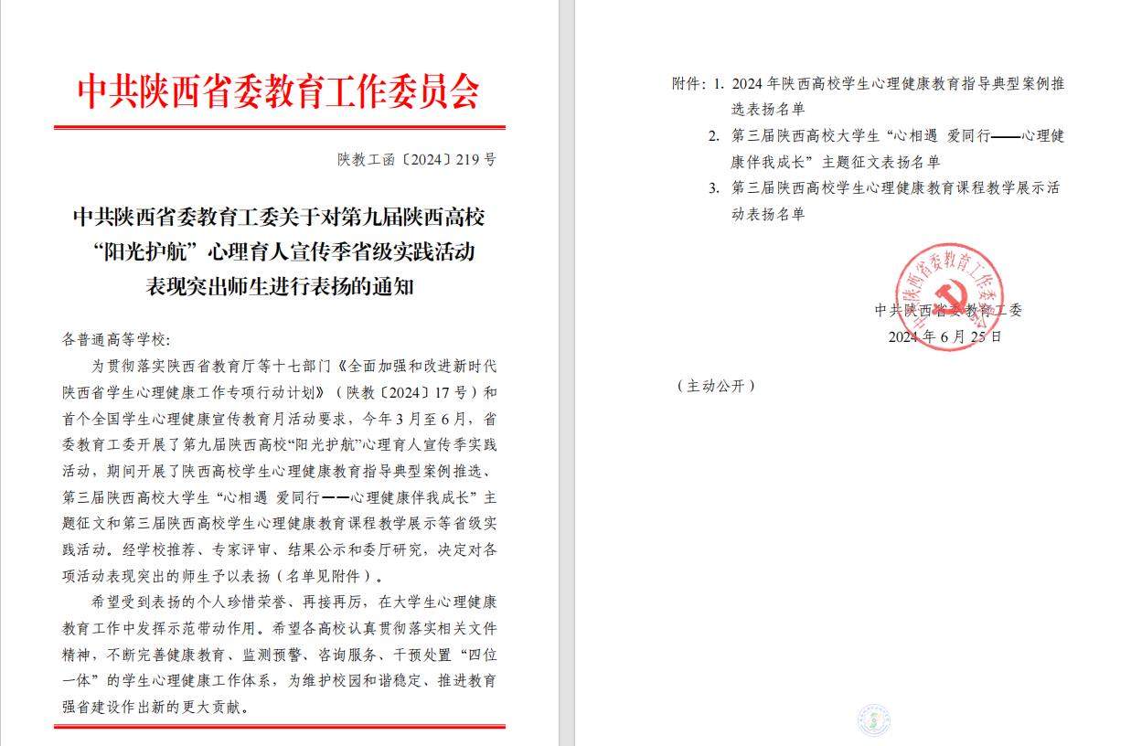 近日,《中共陕西省委教育工委关于对第九届陕西高校“阳光护航”心理育人宣传季省级实践活动表现突出师生进行表扬的通知》公布,米兰官网教师屈娜的《你当像鸟飞往你的山——一例基于整合疗法取向的低自尊咨询案例报告》和教师唐转转的《问题背后还有问题——高职学生心理危机干预个案》分别荣获典型案例二、三等奖;由学生赵晓峰撰写、教师王世璟指导的文章《于纵深处触摸阳光》和学生戴佳艺撰写、教师周靖昆指导的文章《心若在 爱同行》分别荣获第三届陕西高校大学生“心相遇 爱同行——心理健康伴我成长”主题征文二、三等奖。
