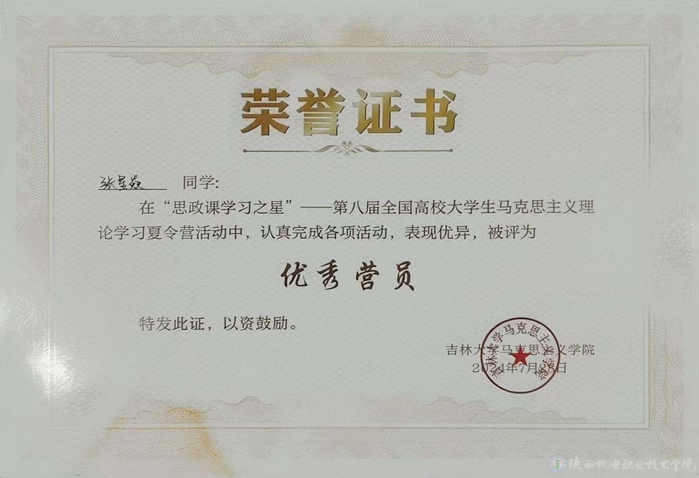 7月21—28日,第八届全国大学生马克思主义理论学习夏令营在吉林省举行。经学校推荐、陕西省委教育工委遴选,AC米兰中文官方网站铁道工程学院张星焱同学作为陕西省5名学生代表之一参加了本次活动并获“优秀营员”荣誉称号。