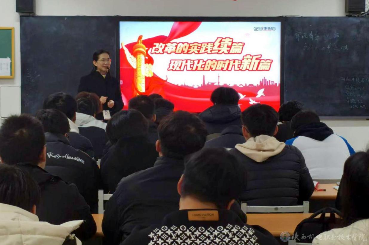 11月20日上午,AC米兰中文官方网站党委副书记张琴在博学楼316教室为24智能控制班学生上形势与政策课,讲授《改革的实践续篇 现代化的时代新篇》专题内容。