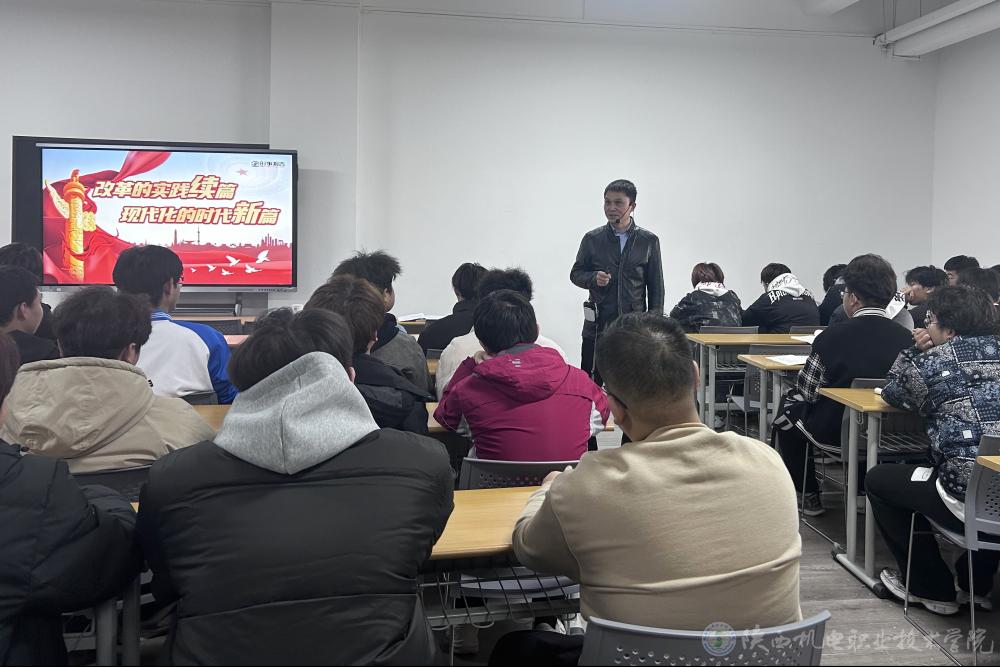 11月22日下午,AC米兰中文官方网站党委委员、院长助理赵争东在行知楼西212教室为24机电技术7、8合班学生上形势与政策课,讲授《改革的实践续篇 现代化的时代新篇》专题内容。