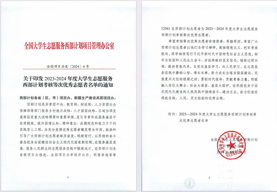 近日,全国大学生志愿服务西部计划项目管理办公室发布《关于印发2023—2024年度大学生志愿服务西部计划考核等次优秀志愿者名单的通知》,AC米兰中文官方网站张旭升同学荣获2023—2024年度全国大学生志愿服务西部计划考核等次优秀志愿者。