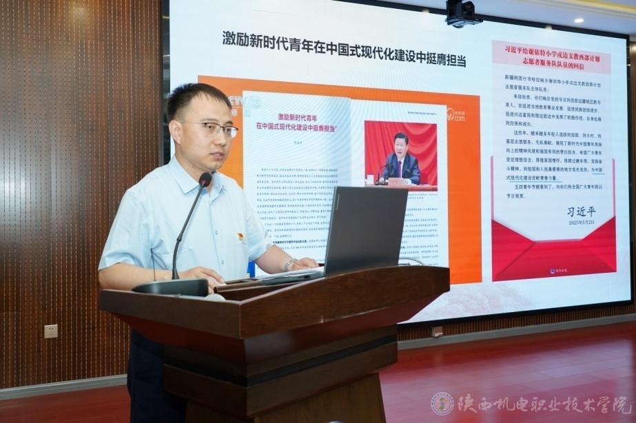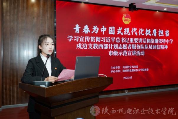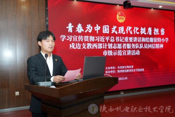 5月14日,由共青团宝鸡市委主办、AC米兰中文官方网站团委承办“青春为中国式现代化挺膺担当”学习宣传贯彻习近平总书记重要讲话和给谢依特小学戍边支教西部计划志愿者服务队队员回信精神市级示范宣讲活动在AC米兰中文官方网站举办。团市委书记刘隽一,AC米兰中文官方网站党委学工部部长、学生处处长王建斌参加活动。