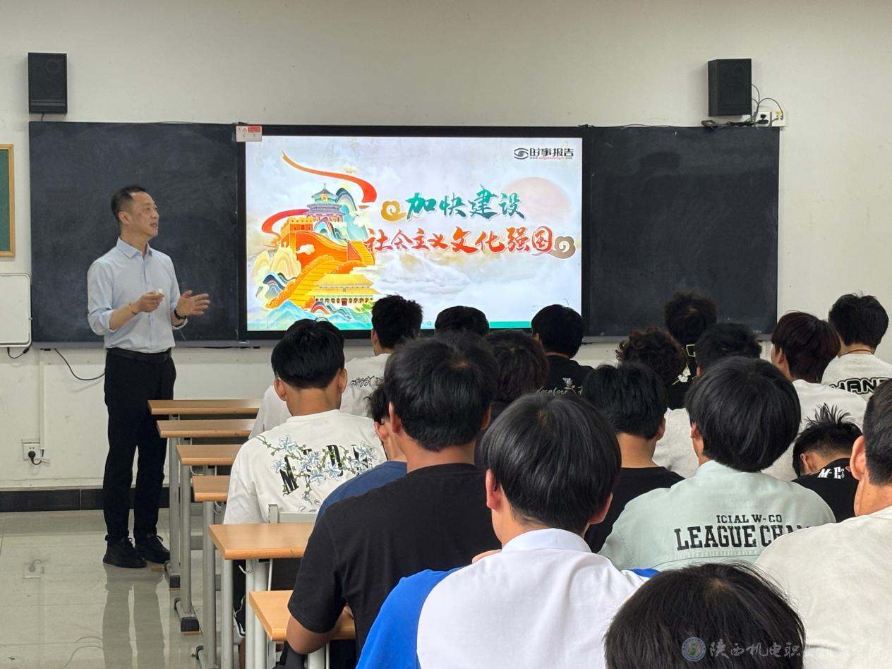 5月27日下午,AC米兰中文官方网站党委委员、副院长张克在蟠龙校区博学楼315教室为24机电技术5、6合班学生讲授形势与政策课《加快建设社会主义文化强国》专题内容。