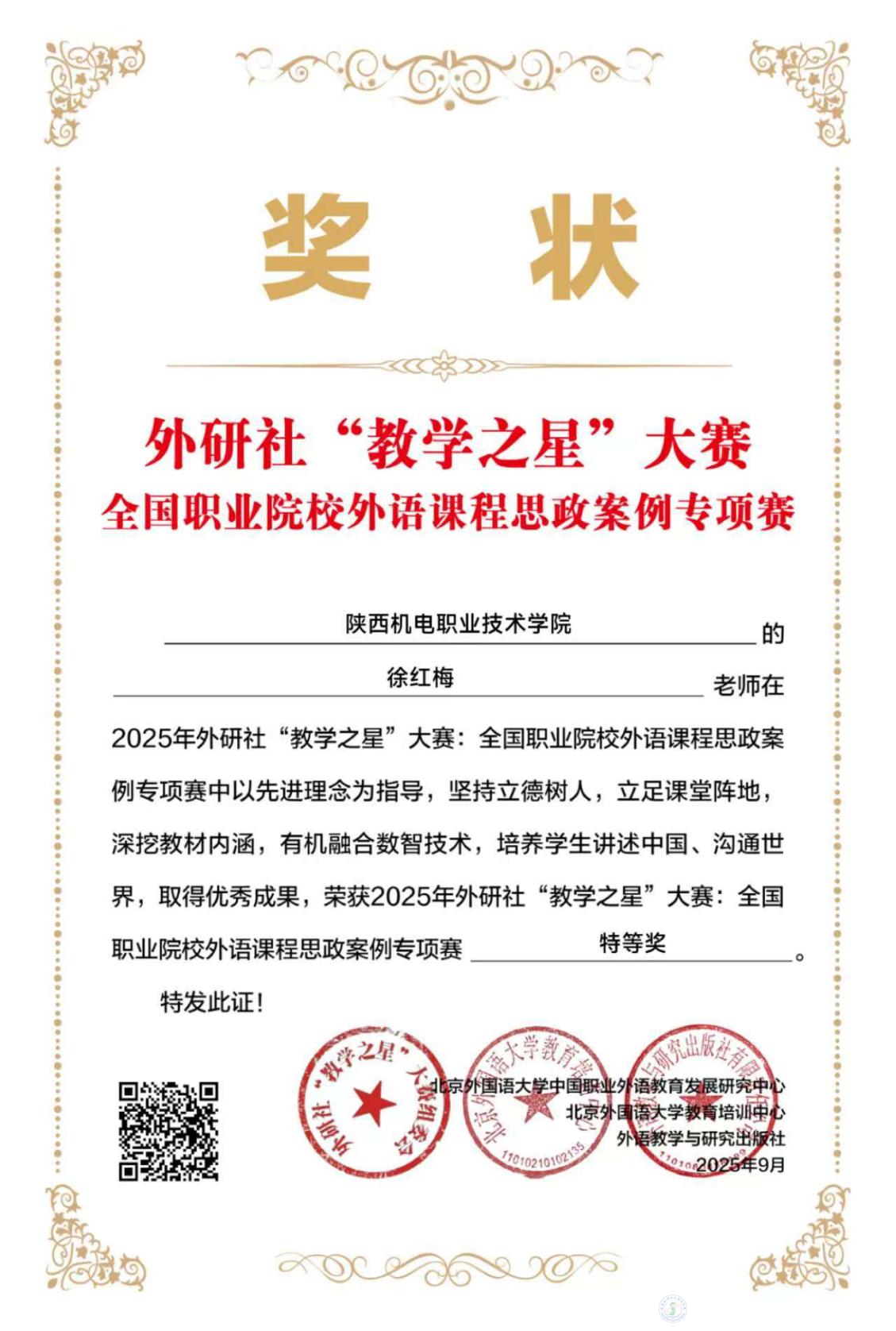 近日,2025年外研社“教学之星”大赛全国职业院校外语课程思政案例专项赛圆满落幕。AC米兰中文官方网站基础部英语教研室徐红梅老师凭借扎实的教学功底和独具创新的思政案例设计,在高职英语组赛道脱颖而出,荣获全国特等奖,为学校赢得殊荣。
