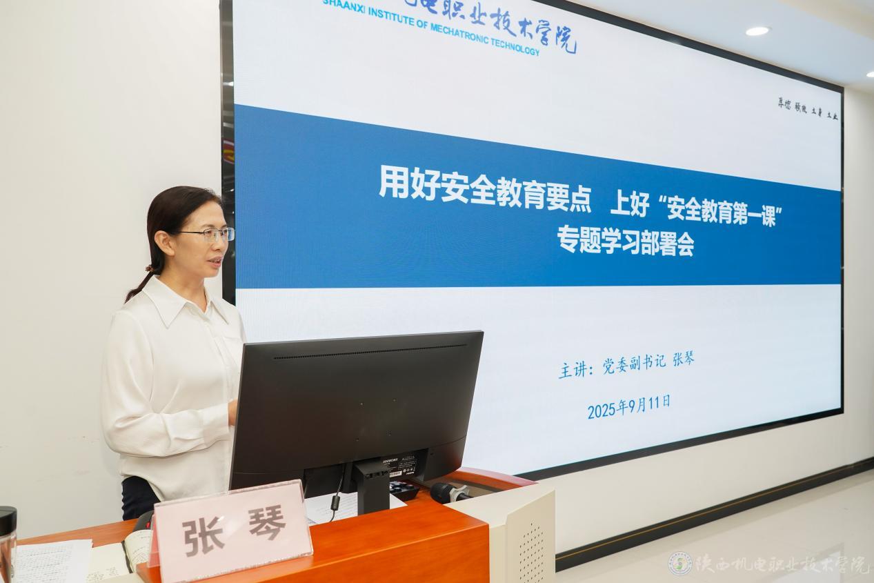 在开学之际,为进一步提高安全教育的针对性和可操作性,用好高校安全教育要点(2025年),深入贯彻落实省委教育工委文件要求,9月11日上午,AC米兰中文官方网站在蟠龙校区大思政教育中心会议室召开专题学习部署会。党委副书记张琴给全校相关部门上“安全教育第一课”。
