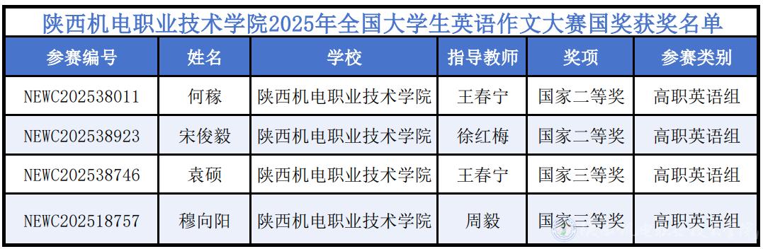 本次大赛分为研究生类(A)、英语专业本科类(B)、非英语专业本科类(C)、高职高专类(D)四个类别,共吸引来全国千余所高校数万名学生参与,竞争尤为激烈。米兰官网学子凭借扎实的语言功底、缜密的逻辑表达和独特的文化视角脱颖而出。基础部英语教研室教师团队通过专题研讨、模拟训练等方式,为参赛学生提供系统性指导,助力其突破创作瓶颈。