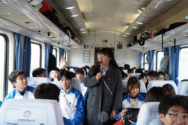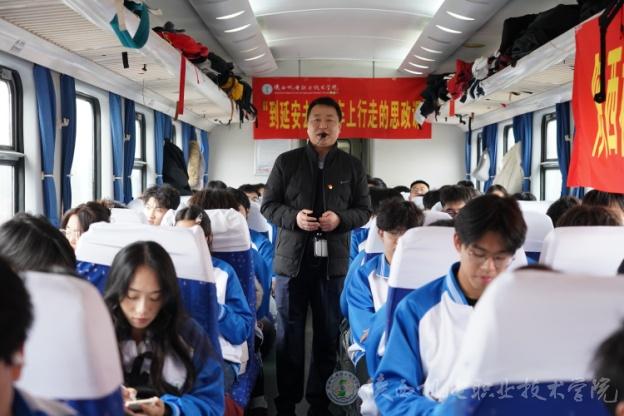 实践活动以车厢内的思政教学正式拉开帷幕。马克思主义学院教师石刚、林妍君分别从抗日战争的波澜壮阔,到南泥湾开垦的艰苦奋斗;从平凡英雄张思德的默默奉献,到习近平总书记在梁家河插队的青春岁月,深入浅出的讲解让学子们沉浸聆听,眼神中满是对历史的敬畏与对革命精神的向往。随后,激昂的红歌《歌唱祖国》在车厢内响起,师生齐声高歌,为此次圣地行奠定了浓厚红色基调。