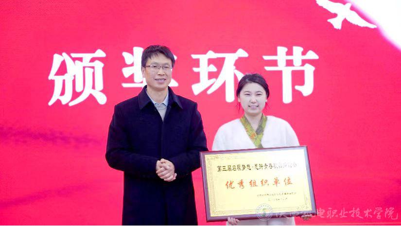 颁奖仪式现场,与会领导及评委为获奖队伍及其指导教师、最佳辩手颁发荣誉证书和奖品,为获得优秀组织奖的二级学院颁发奖牌。