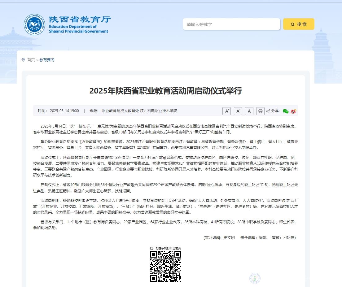 2025年5月14日,以“一技在手,一生无忧”为主题的2025年陕西省职业教育活动周启动仪式在西安市高陵区吉利汽车西安制造基地举行。陕西省政协副主席、省中华职业教育社主任李忠民出席并宣布启动,省级10部门有关同志参加启动仪式并参观吉利汽车“黑灯工厂”和整装车间。