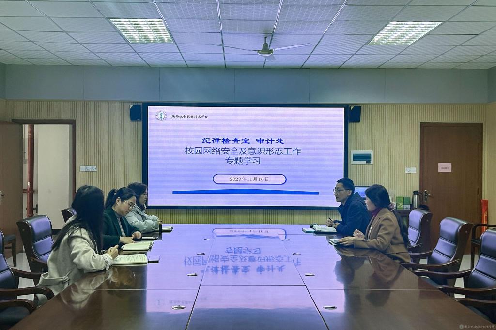 11月10日上午,纪律检查室、审计处在蟠龙校区图书馆二楼会议室召开校园网络安全及意识形态工作专题学习会,审计处负责人张喆主持会议,纪律检查室主任王芙蓉,华怡夏、胡馨月、张小丽参加会议。