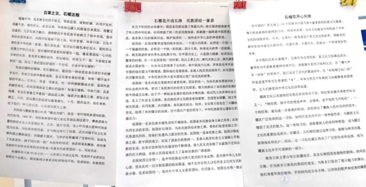 “石榴花开心向党”主题征文中描述了各民族学生独特的文化习俗和传统,通过讲述各族师生共居共学、共建共享、共事共乐的生动故事,弘扬各民族文化与中华文化的内在价值,阐述了民族团结和铸牢中华民族共同体意识的重要性。